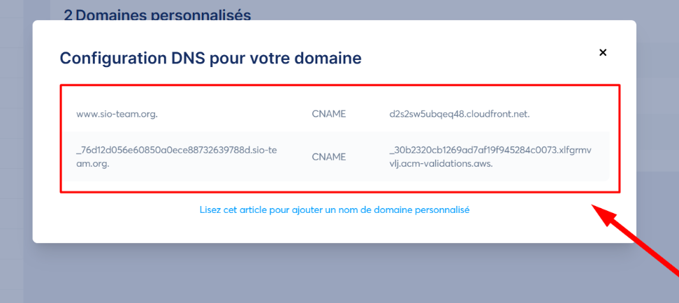 1.3. Une fois le nom de domaine ajouté et enregistré, une nouvelle popup apparaîtra. Vous constaterez deux lignes d'enregistrements DNS que nous appelons CNAME. Ces CNAME sont les DNS que vous allez ajouter sur votre hébergeur pour connecter votre nom de domaine :