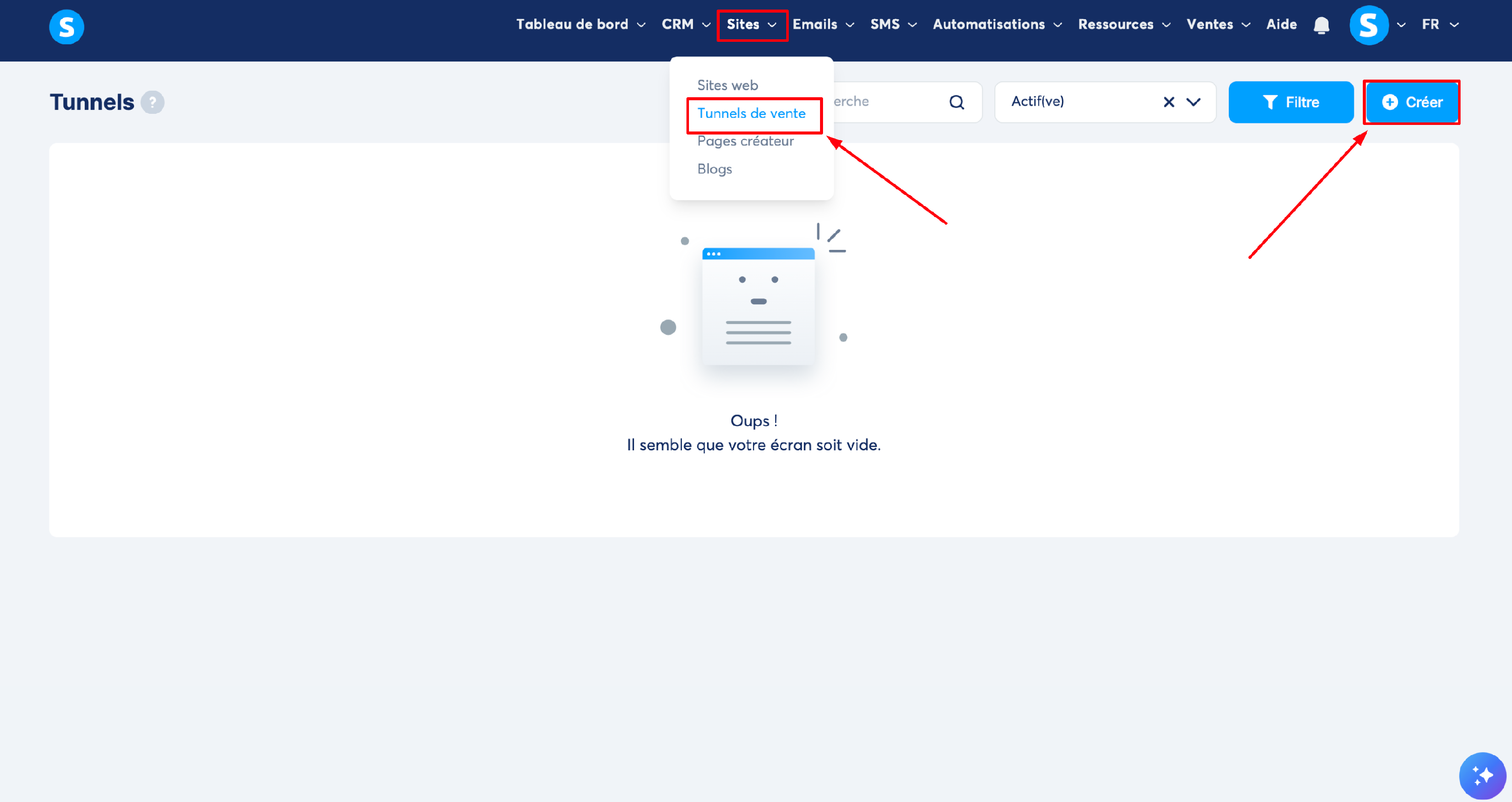 Pour créer votre tunnel, rendez-vous dans "Sites", puis "Tunnels de vente", puis cliquez sur "Créer".