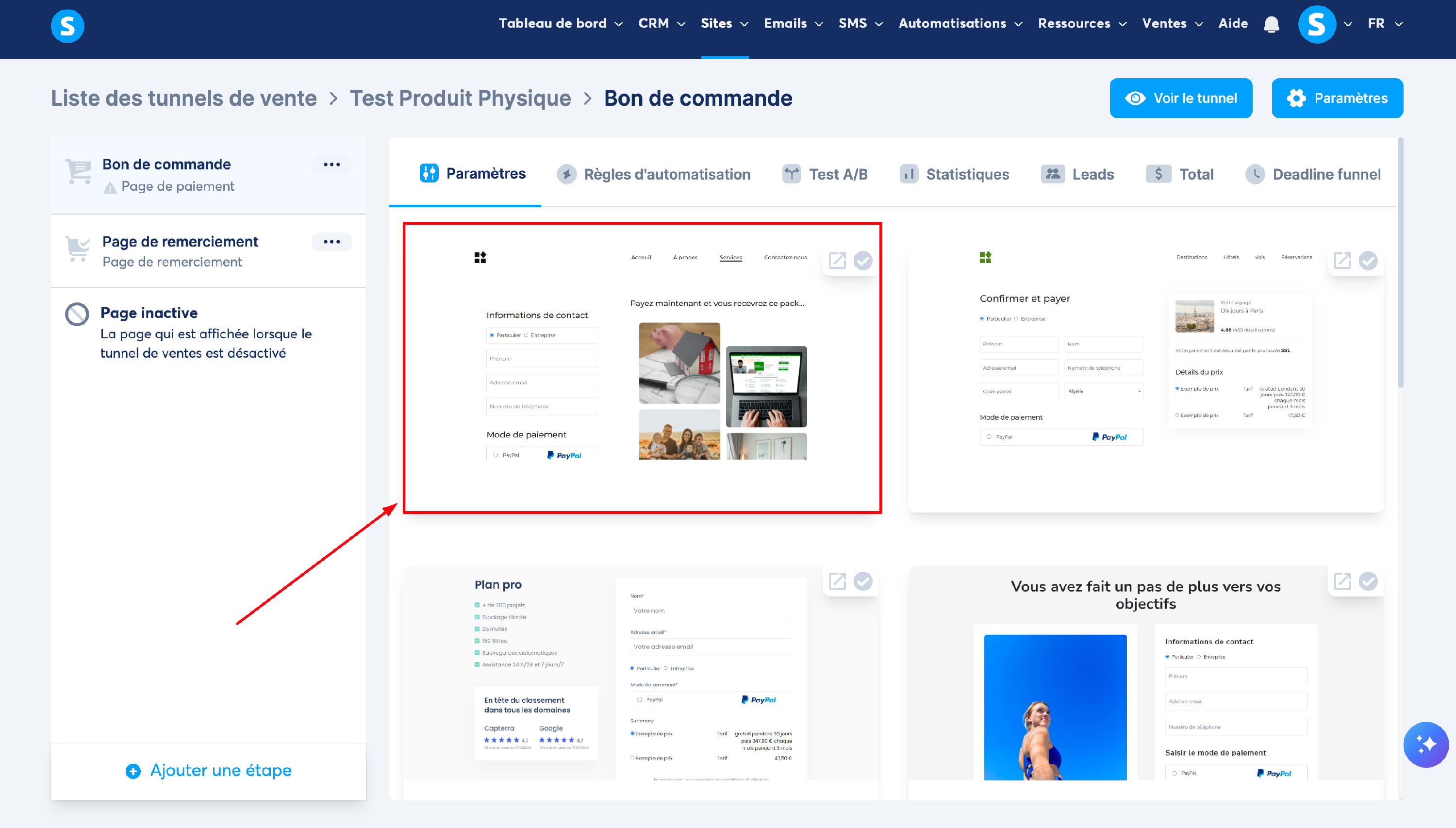 Pour la vente de produits, vous aurez essentiellement besoin d'une page de paiement et d'une page de remerciement. (en choisissant le tunnel de vente « Vendez votre produit » vous avez les deux pages déjà prêtes). Vous pouvez, selon vos besoins, ajouter une page de capture, une page de vente, mais également une page upsell et downsell.