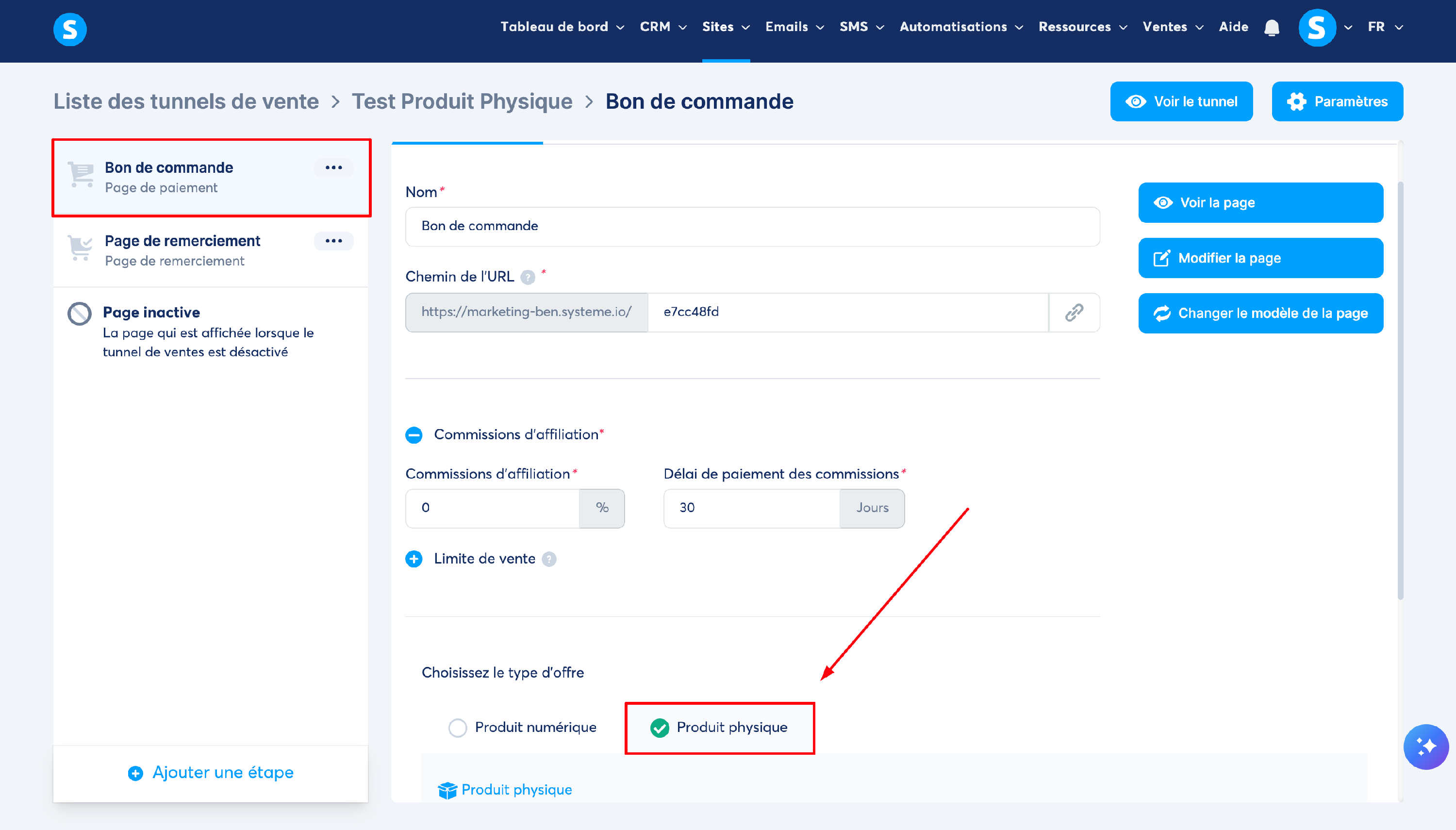 Remarque importante : après paiement, le client recevra le produit physique dont vous devez procéder à sa livraison en externe, car cela ne peut pas être fait au niveau de systeme.io.