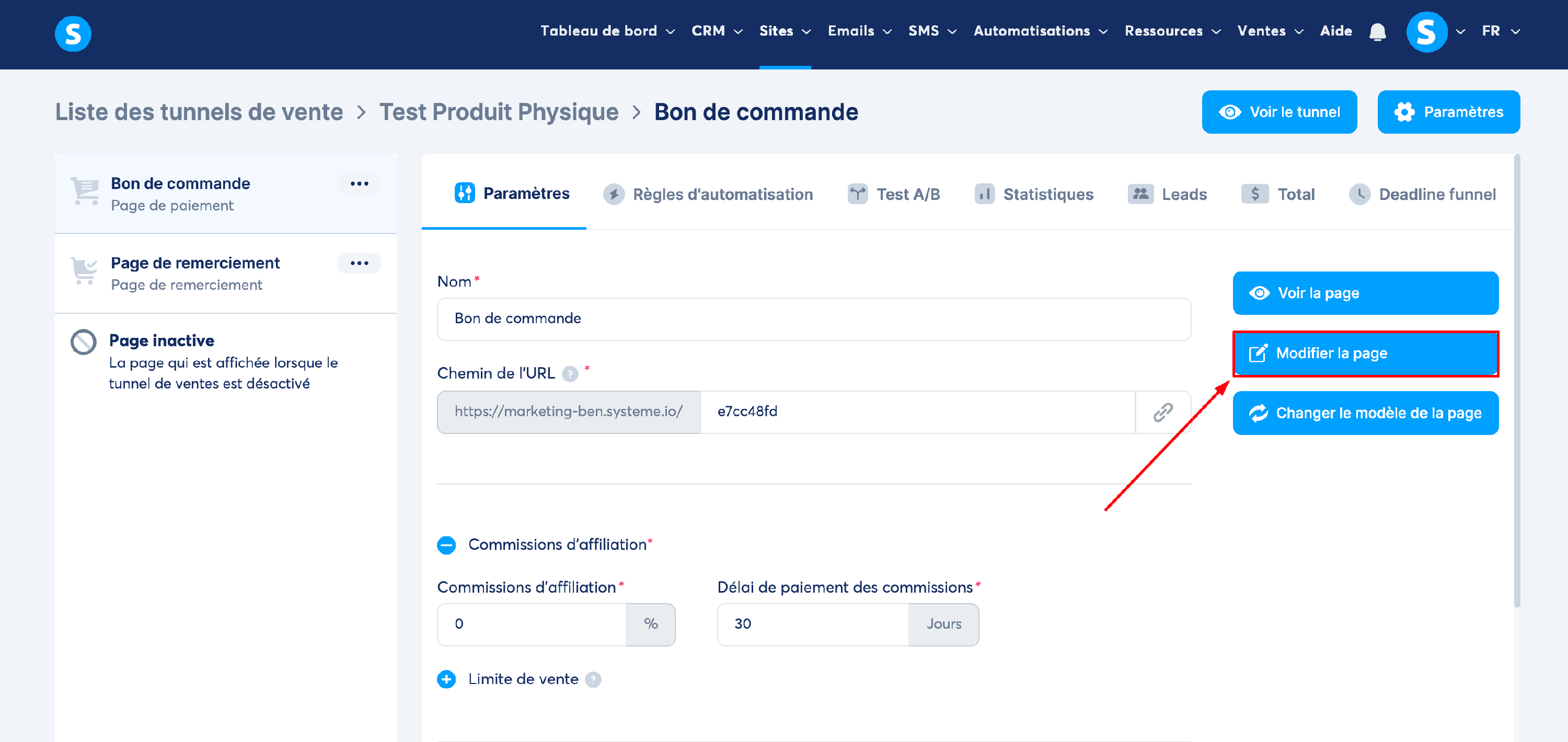 Pour commencer, sur la même page, vous cliquez sur "Modifier la page" pour accéder à l'éditeur de la page.