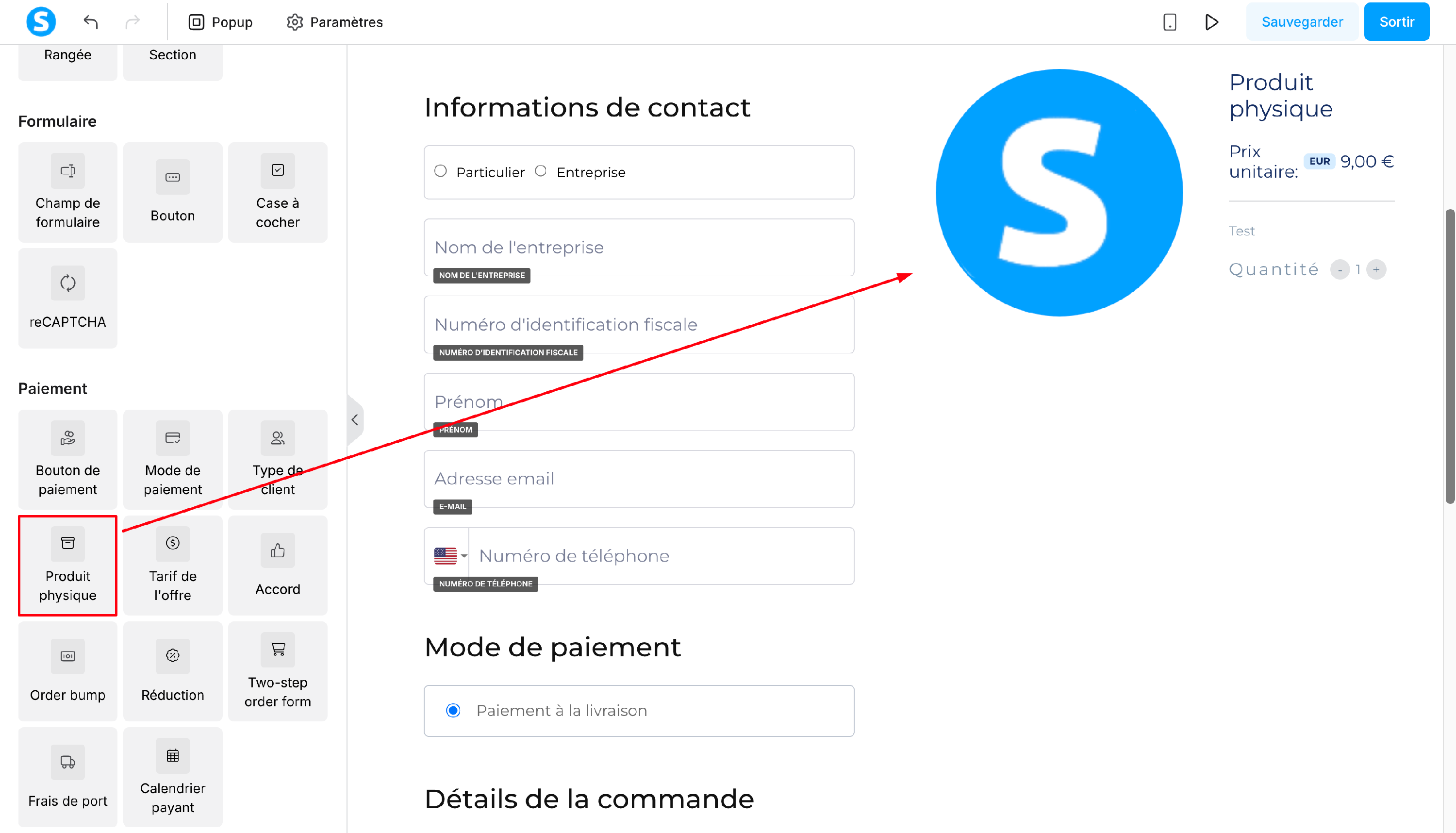 Ensuite, vous glissez l'élément "Produit physique" qui se trouve à gauche de l'éditeur dans la section "Paiement" et vous le déposez à l'emplacement que vous avez choisi.