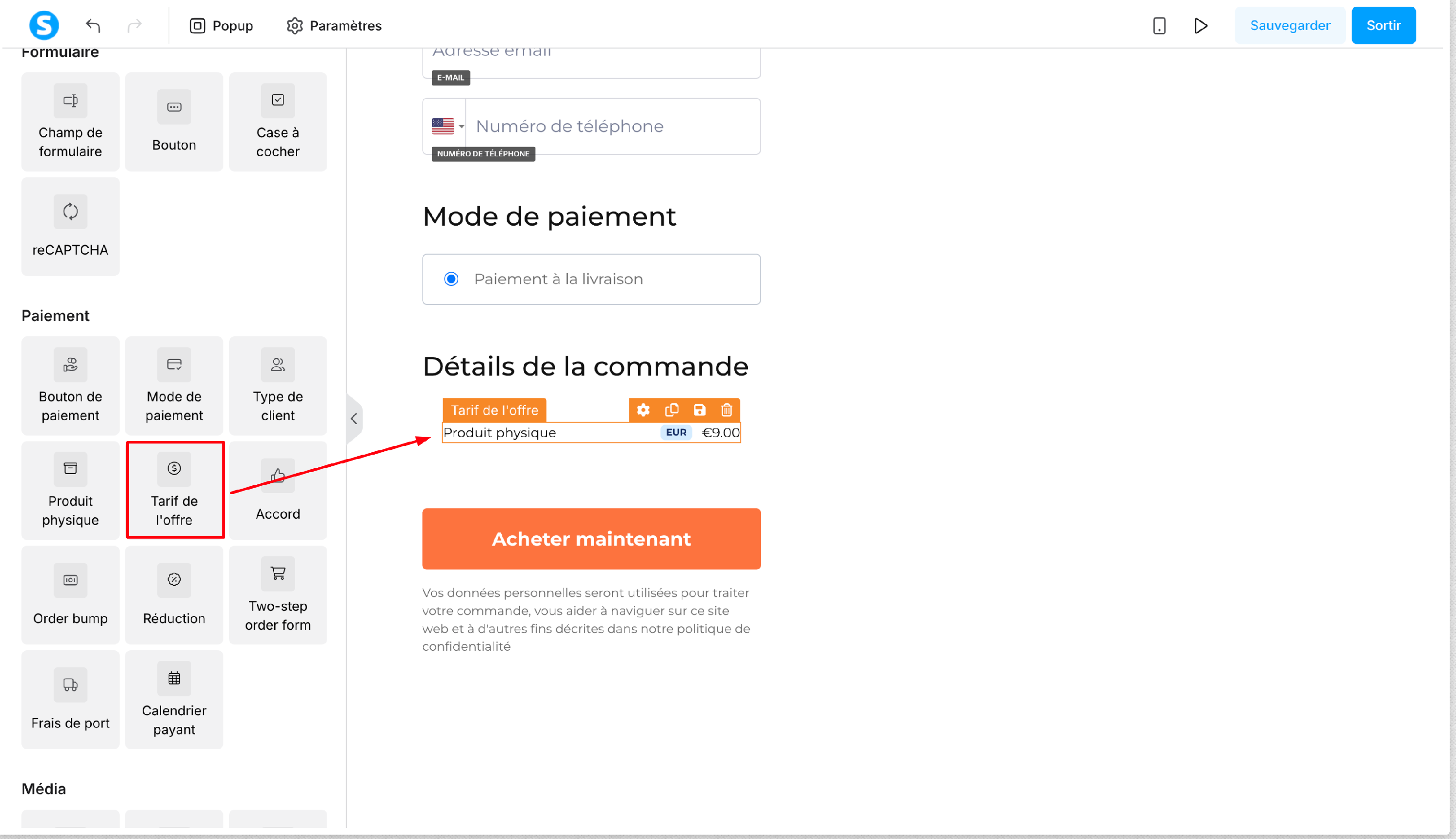 Après avoir bien mis en place votre produit sur votre page de paiement, il est temps d'ajouter le tarif. Là encore, vous devez glisser et déposer l'élément "Tarif de l'offre" qui se trouve aussi dans la section "Paiement"