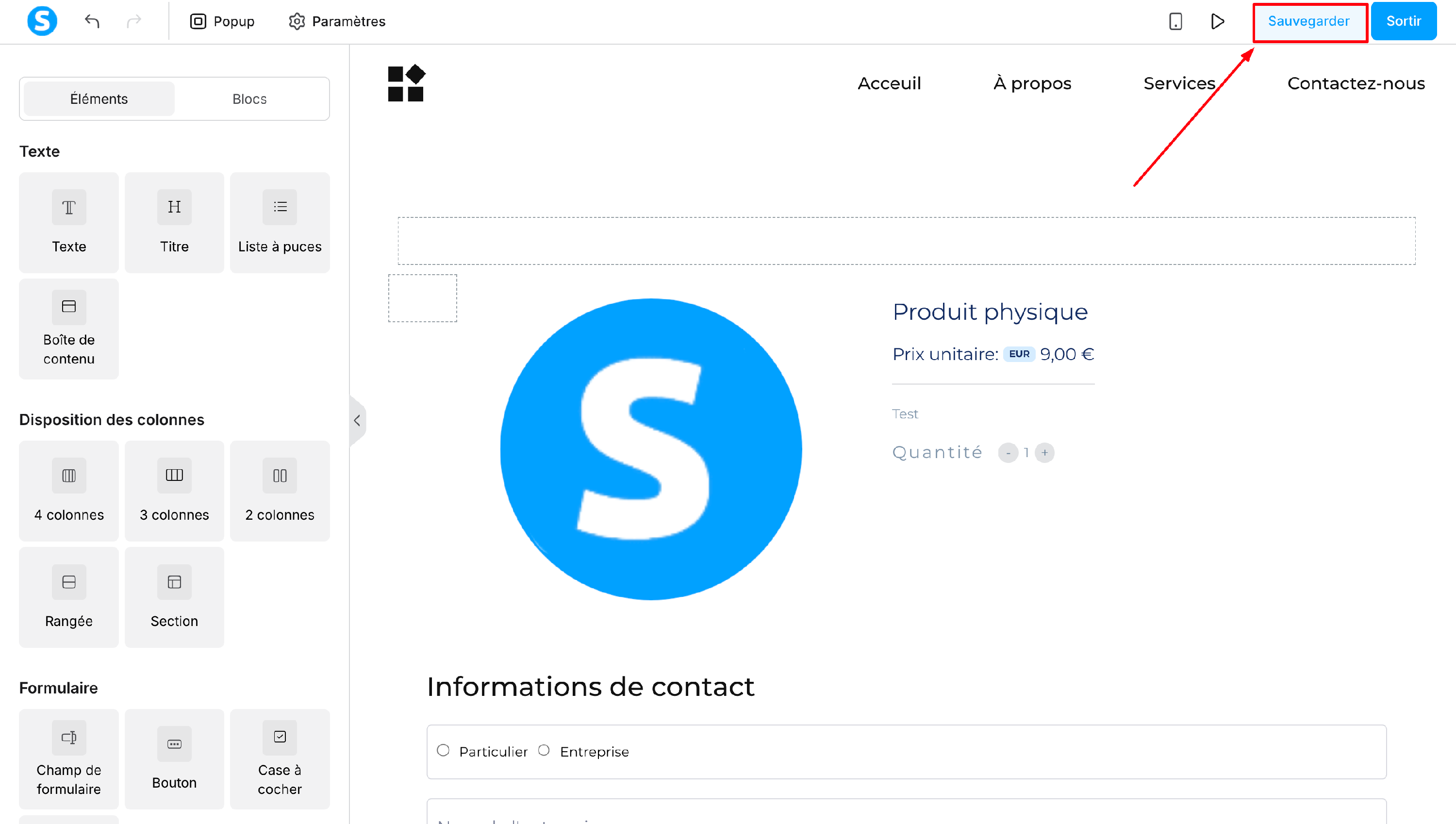 Note : à chaque fois que vous avez fini d'éditer une page ou que vous avez apporté une modification quelconque, vous devez sauvegarder en cliquant sur "Sauvegarder" à droite, tout en haut. Sachez qu'il n'y a pas d'auto-sauvegarde dans l'éditeur de vos pages.