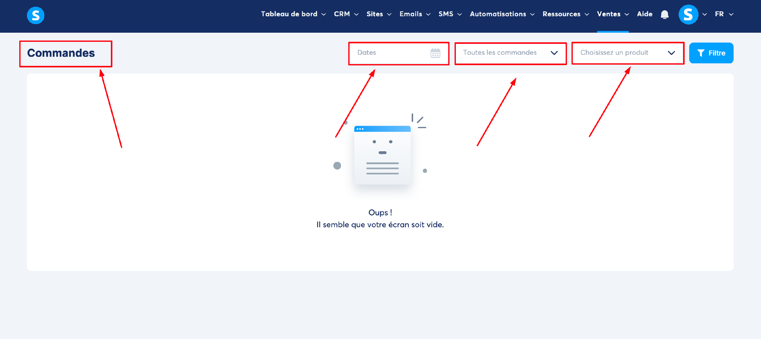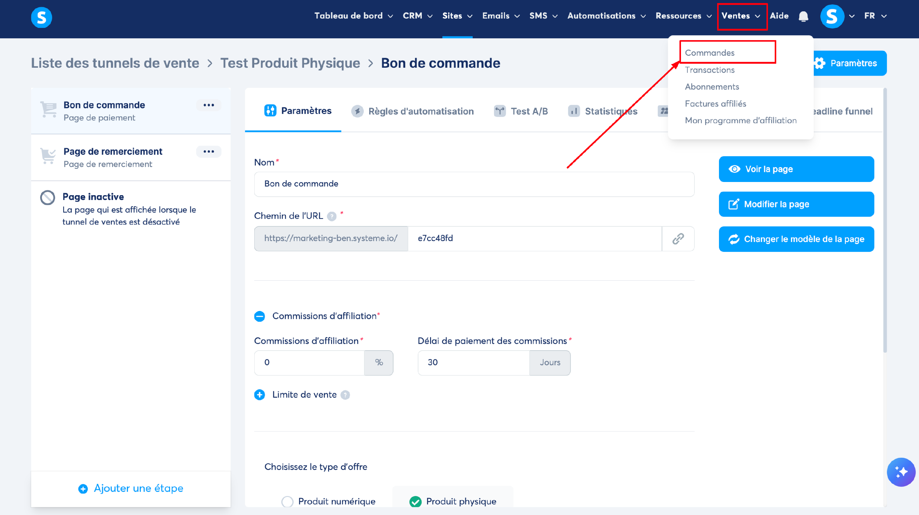 Pour finir, dans votre compte systeme.io, vous avez la possibilité de retrouver toutes les commandes de vos clients. Pour cela, rendez-vous dans "Ventes", puis "Commandes".