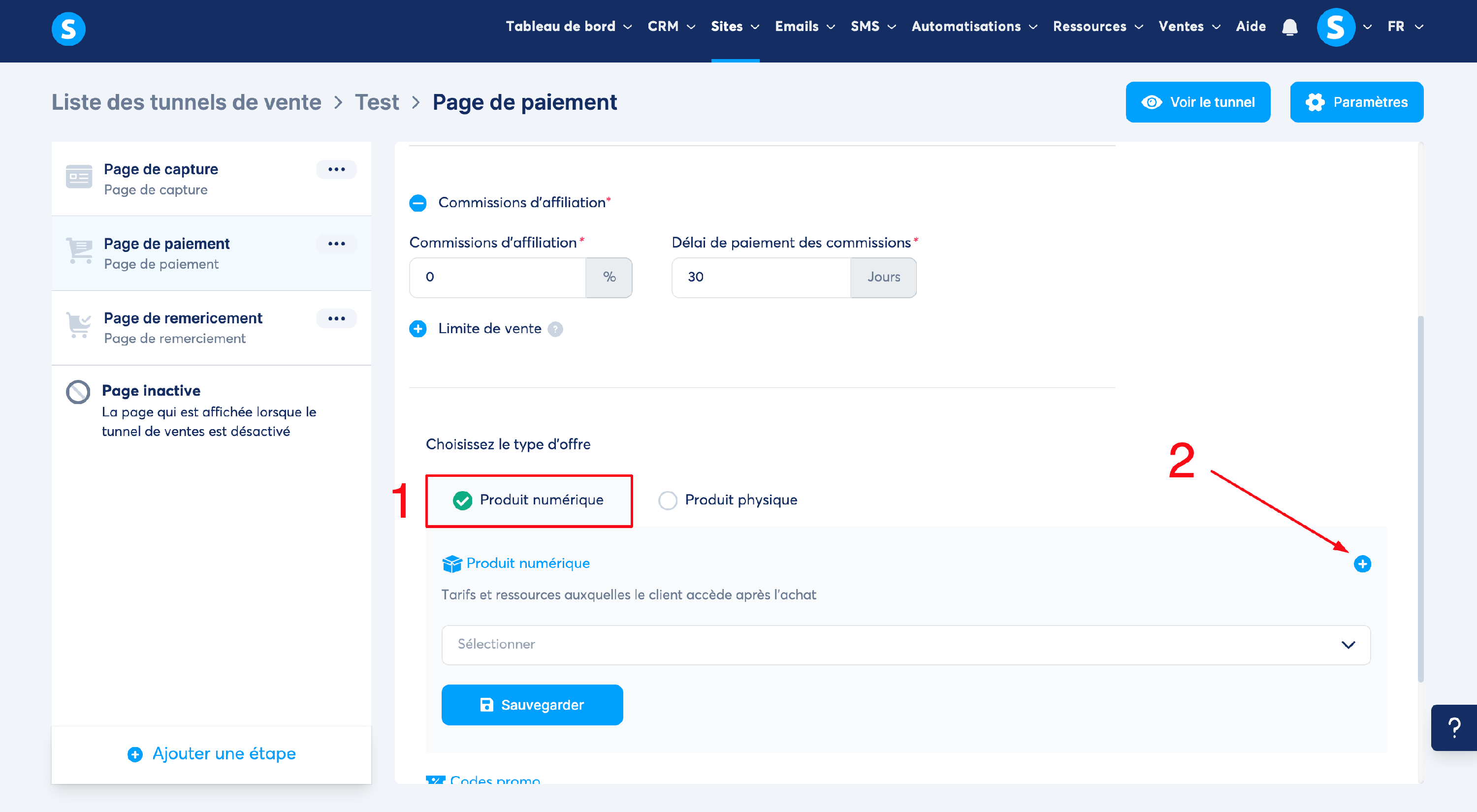 Dans votre tunnel de vente, cliquez d'abord sur votre page de paiement, puis une fois sur celle-ci, vous allez y mettre la formation que vous avez créée. Vous devez, pour cela, choisir "Produit numérique" parmi les deux types d'offres disponibles sur la page de paiement. (numéro 1 sur l'image)