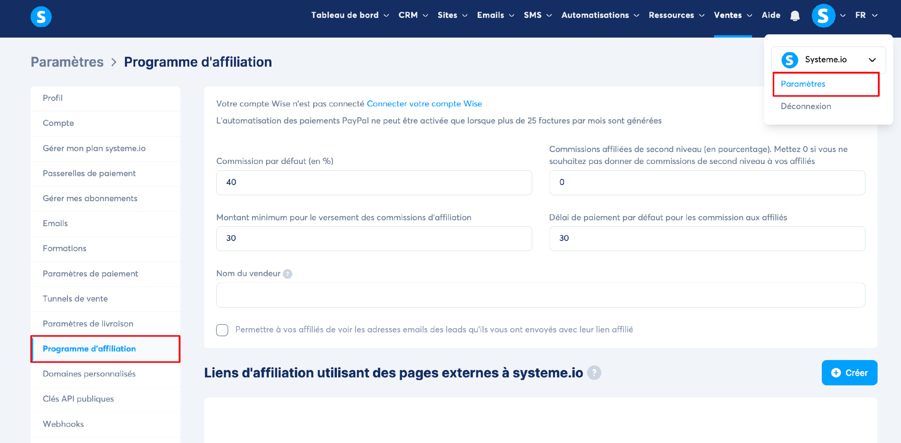 Comment créer un lien d'affiliation avec une page externe à systeme.io