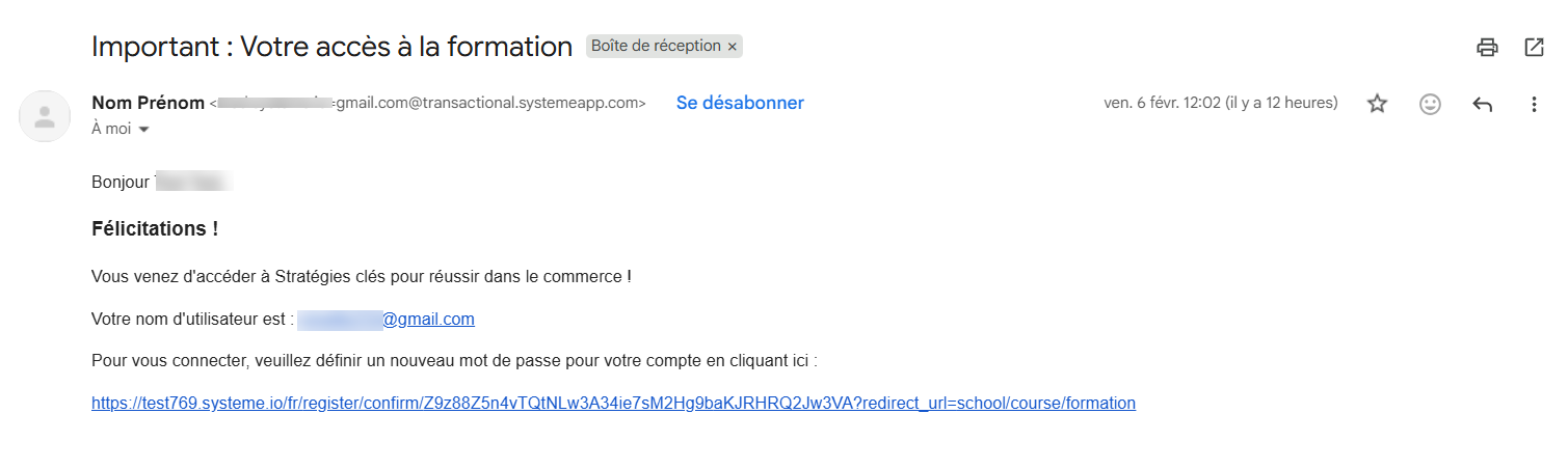 Lorsqu'un élève rejoint une formation (que ce soit via une page de paiement, une page de capture ou un ajout manuel), il reçoit automatiquement un email. Ce courriel contient un message de félicitations en son nom, son identifiant de connexion, ainsi qu'un lien pour définir son mot de passe.