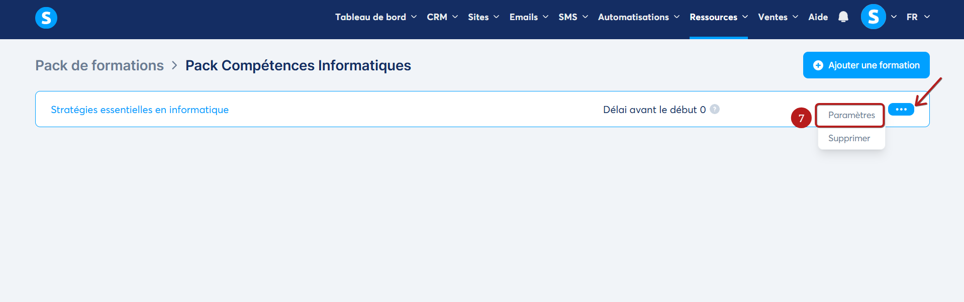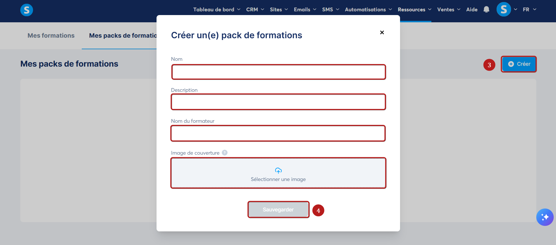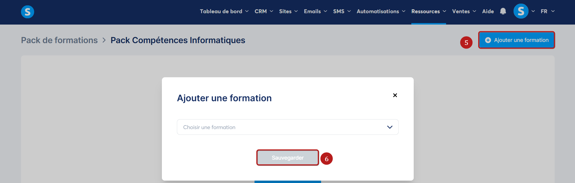 Cliquez sur le bouton "Ajouter une formation" (5), puis sélectionnez les formations à inclure sur votre pack et enregistrez en cliquant sur "Sauvegarder" (6).