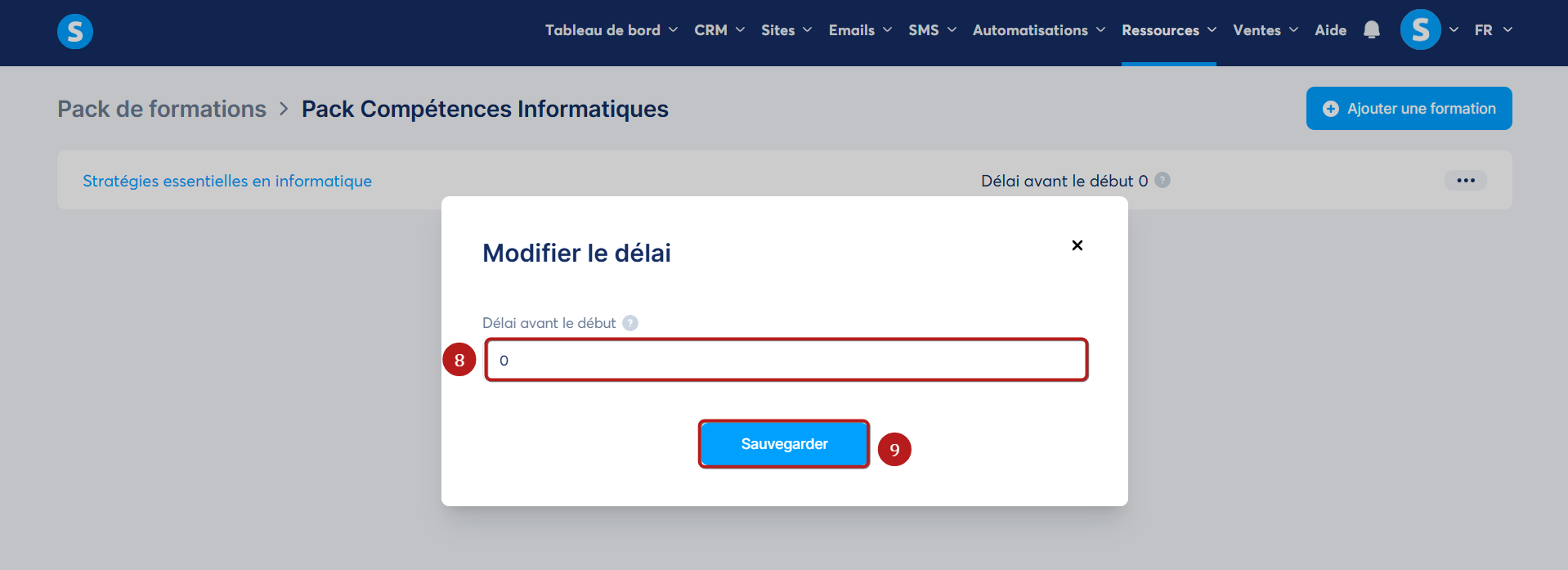 Une fois la formation ajoutée à votre pack, vous devez configurer un "Délai avant le début". Cela correspond au temps d'attente avant le déblocage de cette formation spécifique, si vous vendez le pack en accès distillé.
