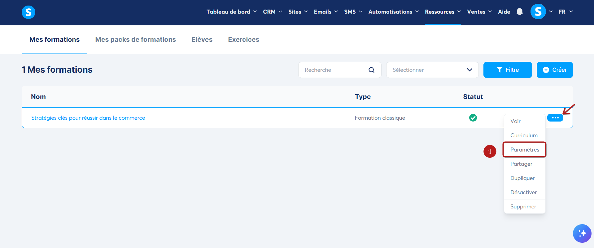 Pour pouvoir modifier les informations d'une formation, vous devez vous rendre sur la formation concernée, cliquer sur les 3 points, ensuite sur "Paramètres" (1).