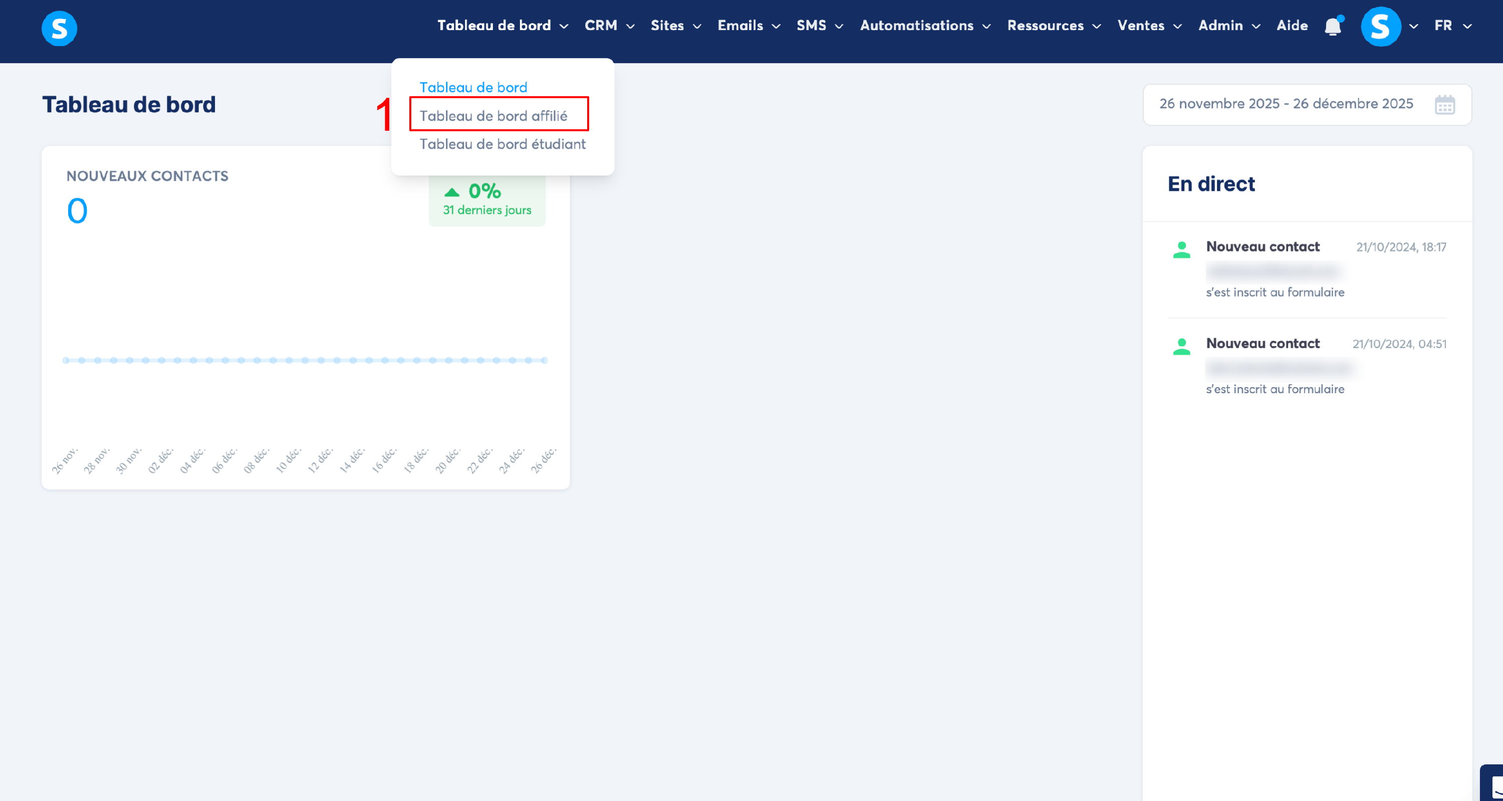 Pour retrouver votre identifiant affilié, allez dans "Tableau de bord" ensuite "Tableau de bord affilié".(numéro 1 sur l’image)