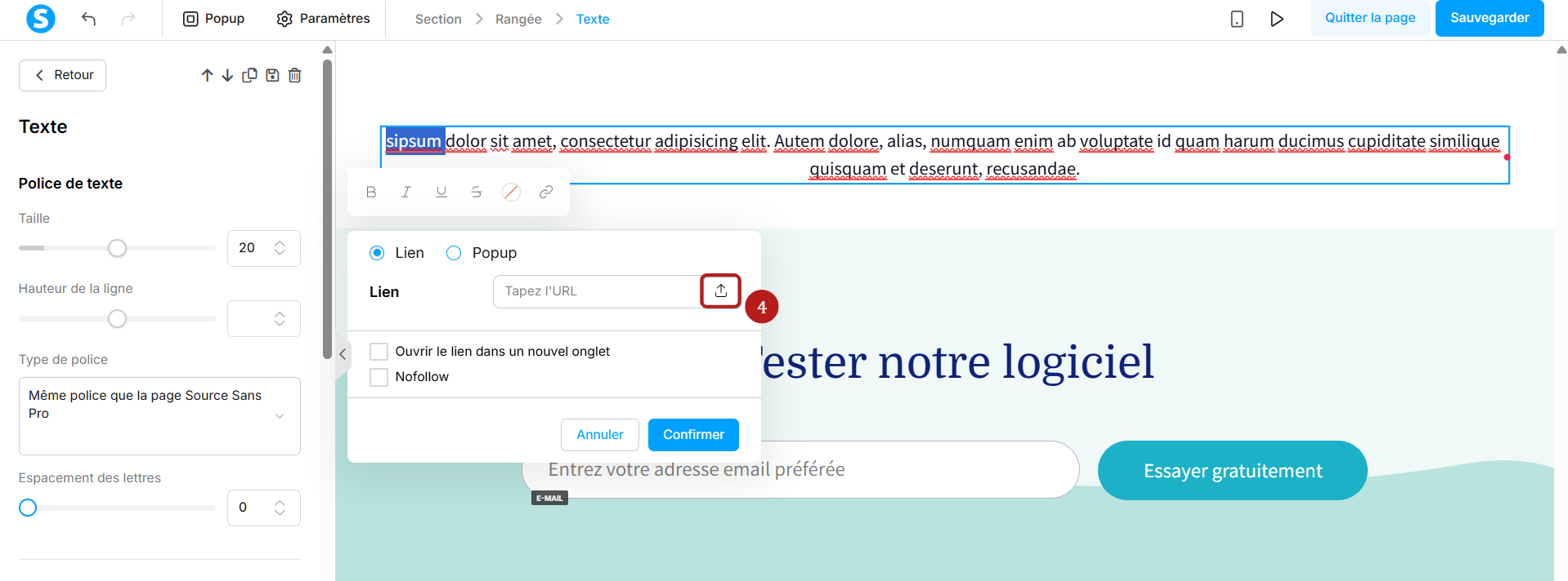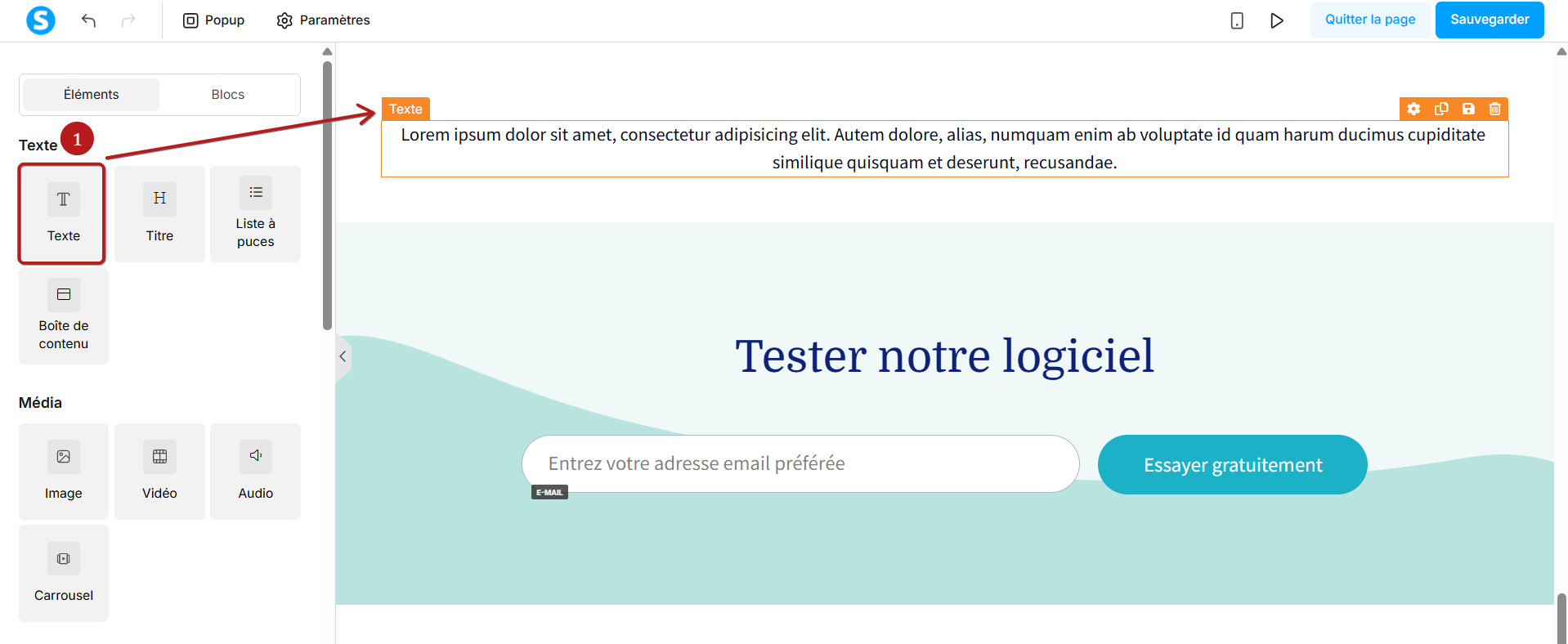 Faites glisser l’élément "Texte" sur votre page (1).
