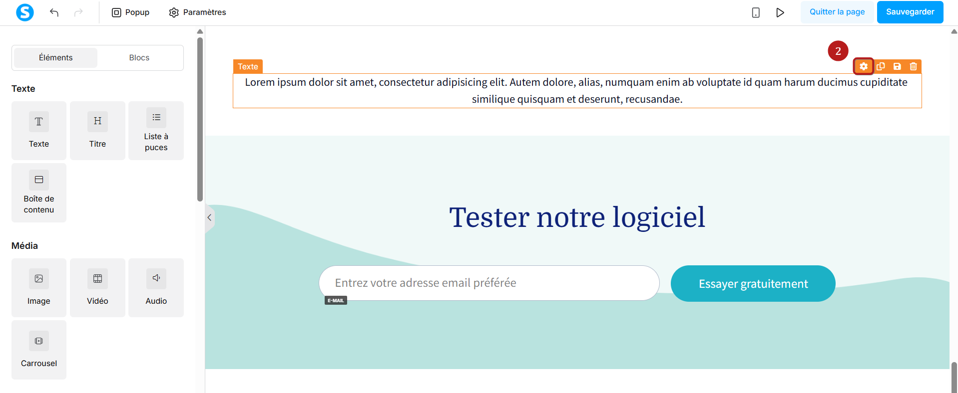 Survolez le texte avec votre souris : un cadre orange apparaîtra. Cliquez ensuite sur l’icône des paramètres (2).