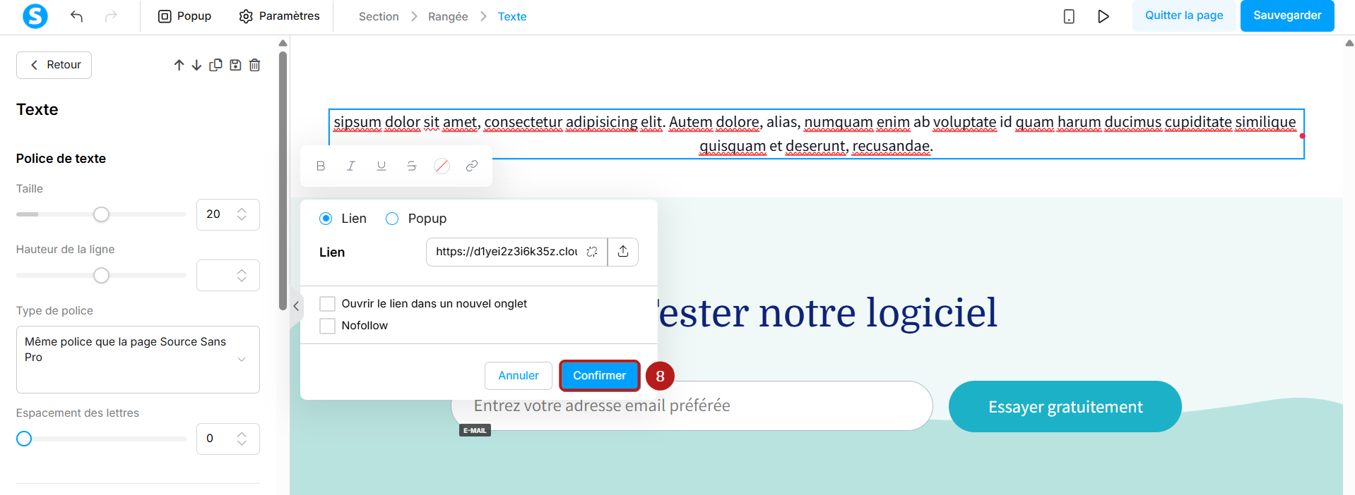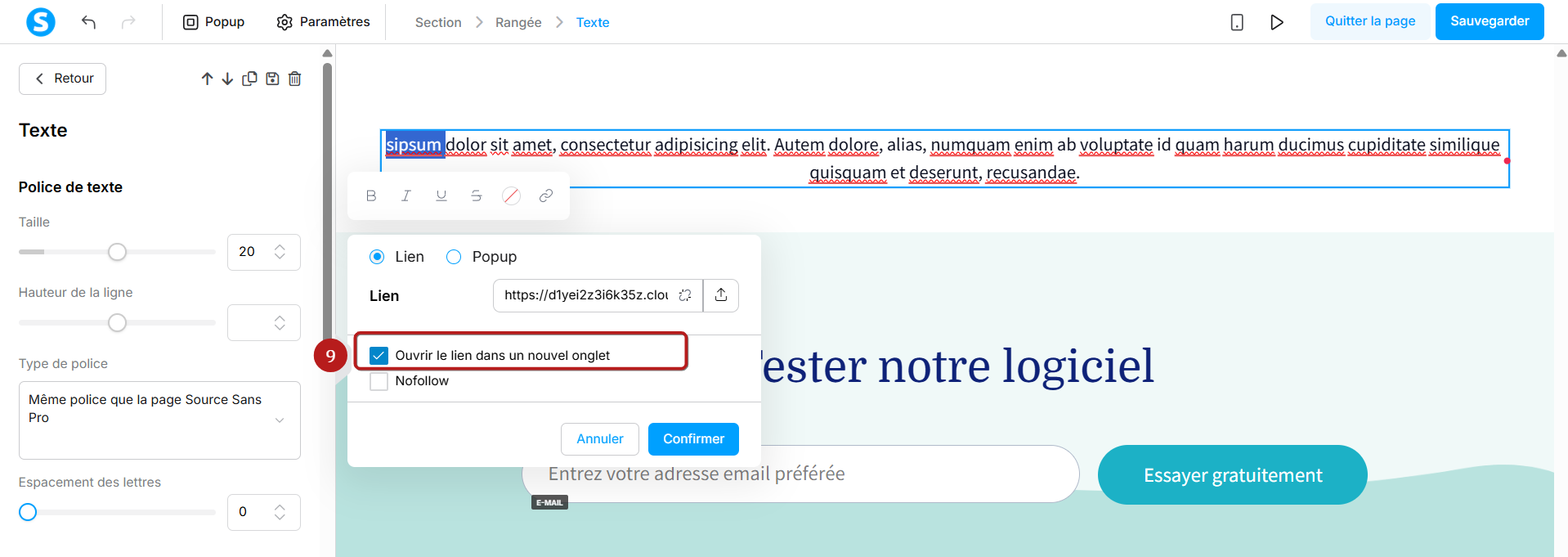 Si vous souhaitez que le lien s'ouvre dans un nouvel onglet, cochez la case "Ouvrir le lien dans un nouvel onglet" (9).