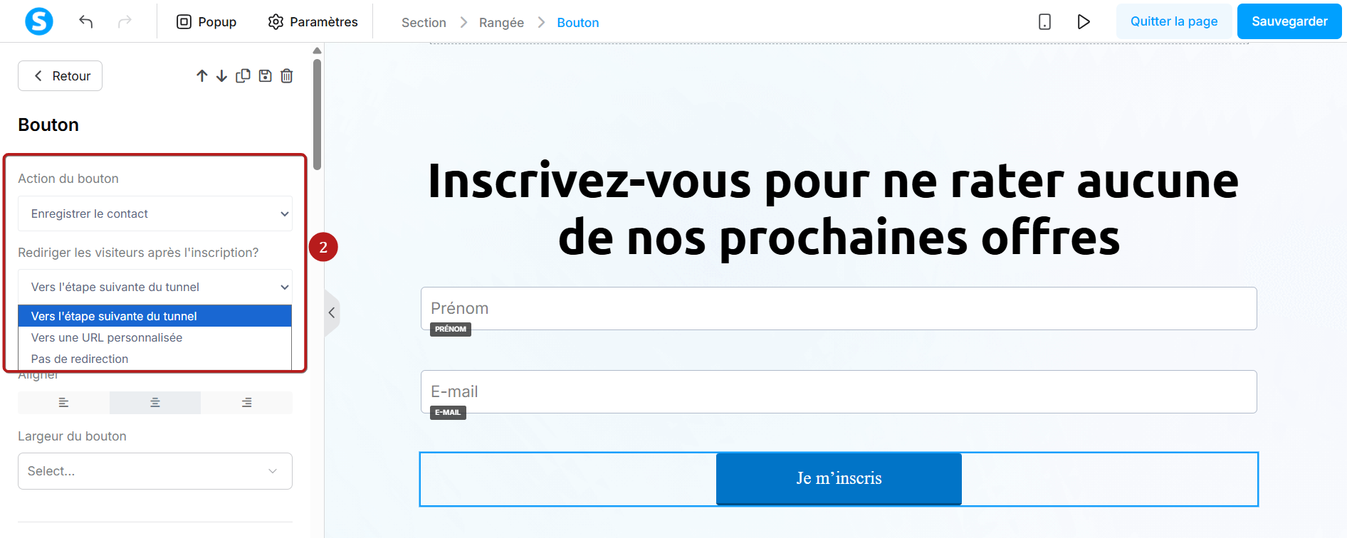 Pour que les contacts soient ajoutés à votre liste, il est important de configurer l'action du bouton sur "enregistrer le contact" puis de rediriger vers l'étape suivante ou une page de votre choix (2).