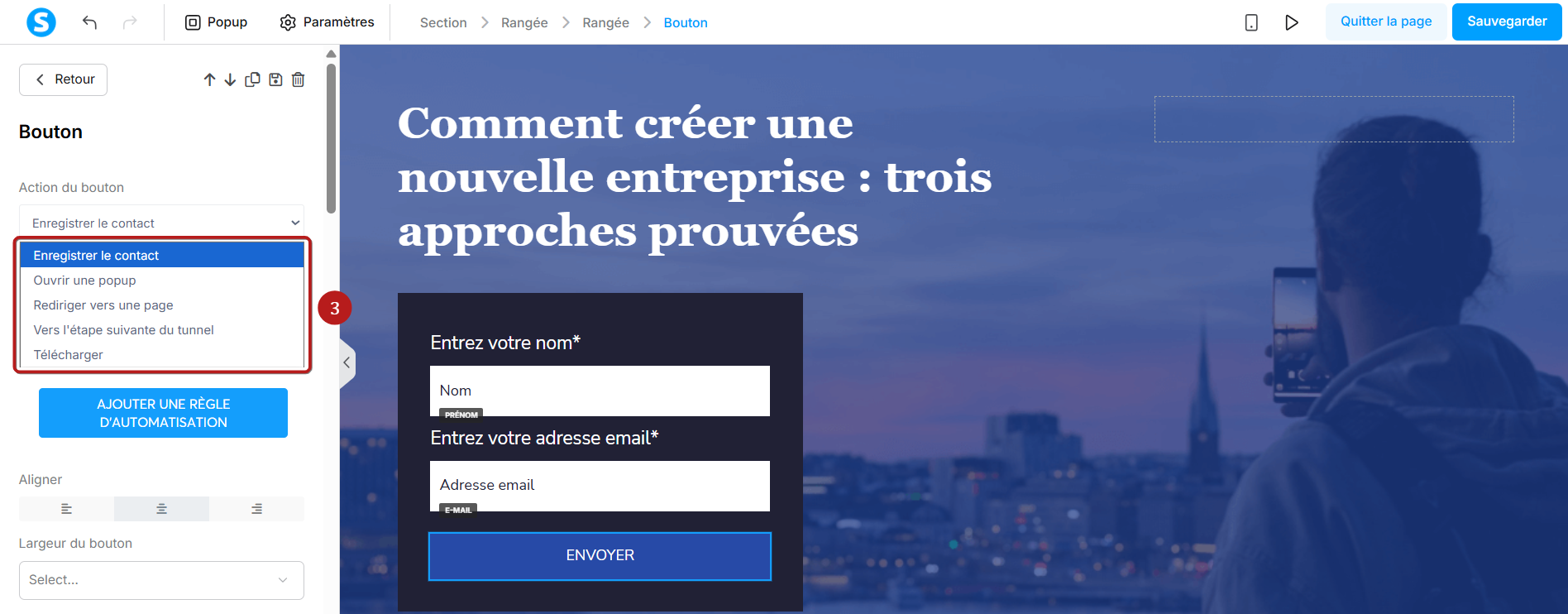 Une colonne de paramètres apparaît sur la gauche, proposant 5 options pour configurer l'action du bouton (3).