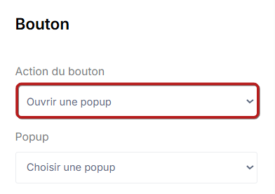 Il est important de noter qu'il est indispensable de créer au préalable une popup sur votre page comme décrit sur l'article "Comment créer un popup sur une page" pour pouvoir choisir un popup pour la configuration du bouton.
