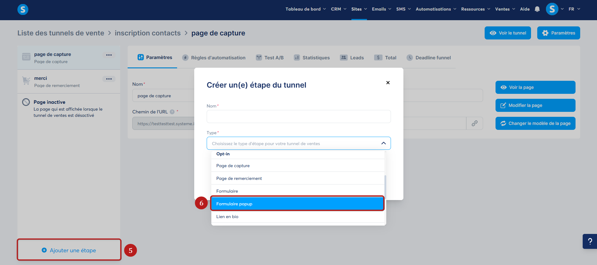 Étape 1 : créer un formulaire de contact sous forme de popup en vous dirigeant vers votre tunnel de ventes, puis en ajoutant une nouvelle page sur celui-ci (numéro 5 sur l'image), choisir "Formulaire Popup" (numéro 6 sur l'image) puis sélectionner l'un des templates de votre choix.
