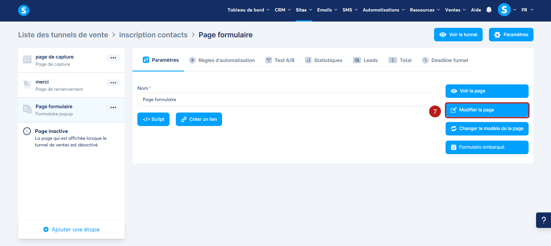 Vous pouvez ensuite modifier à votre page popup, il vous suffit de vous diriger vers l'éditeur de la page de formulaire popup depuis le bouton "Modifier la page" (numéro 7 sur l'image)