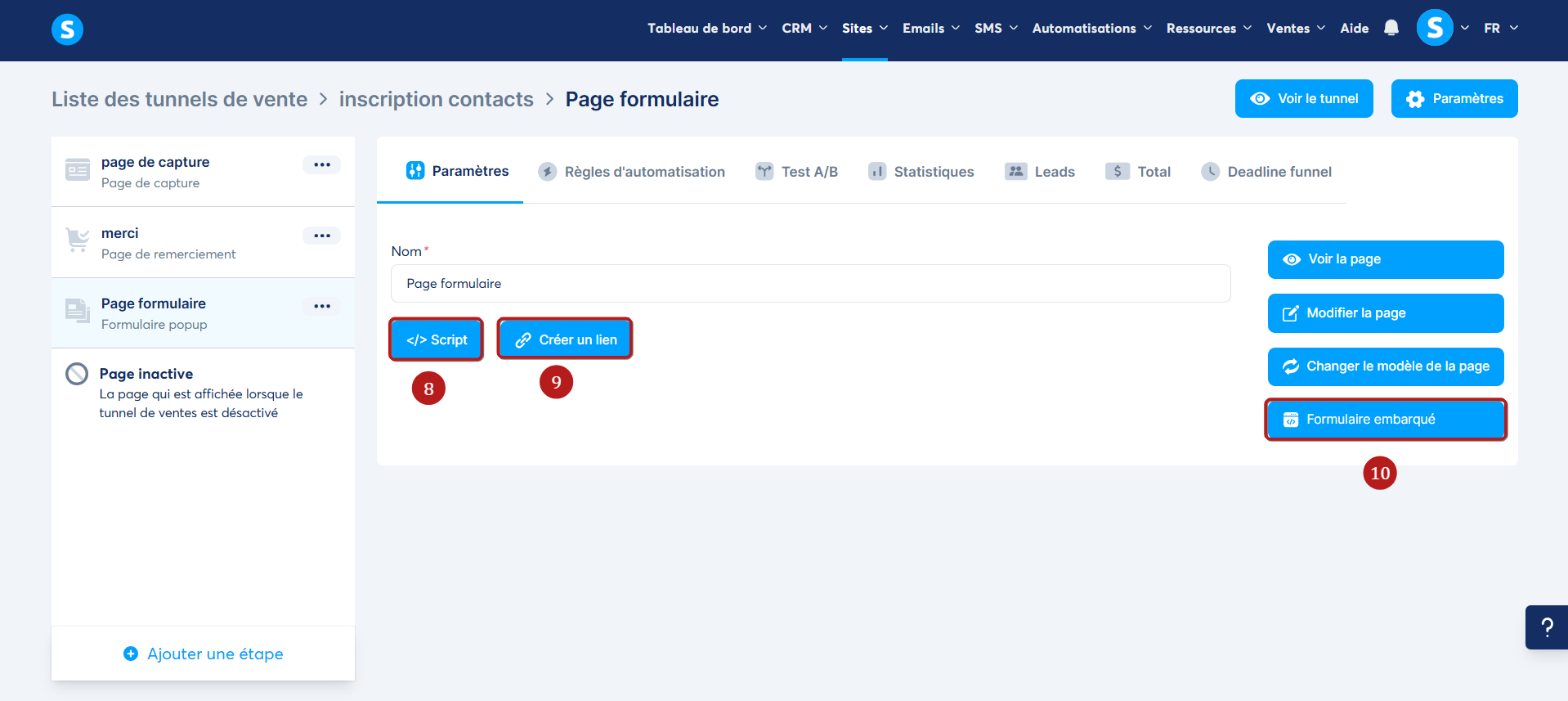 - Copier le formulaire embarqué de votre popup en cliquant sur le bouton "formulaire embarqué" (numéro 10 sur l'image)