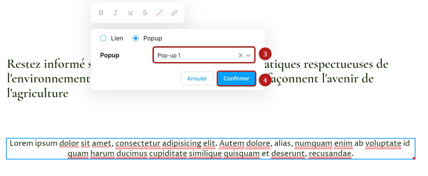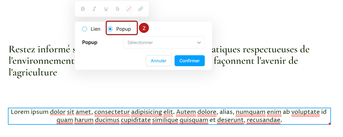 Sélectionner le texte sur lequel vous désirez actionner l'ouverture d'une popup, puis cliquez sur l'icône en forme de chaine (numéro 1 sur l'image)