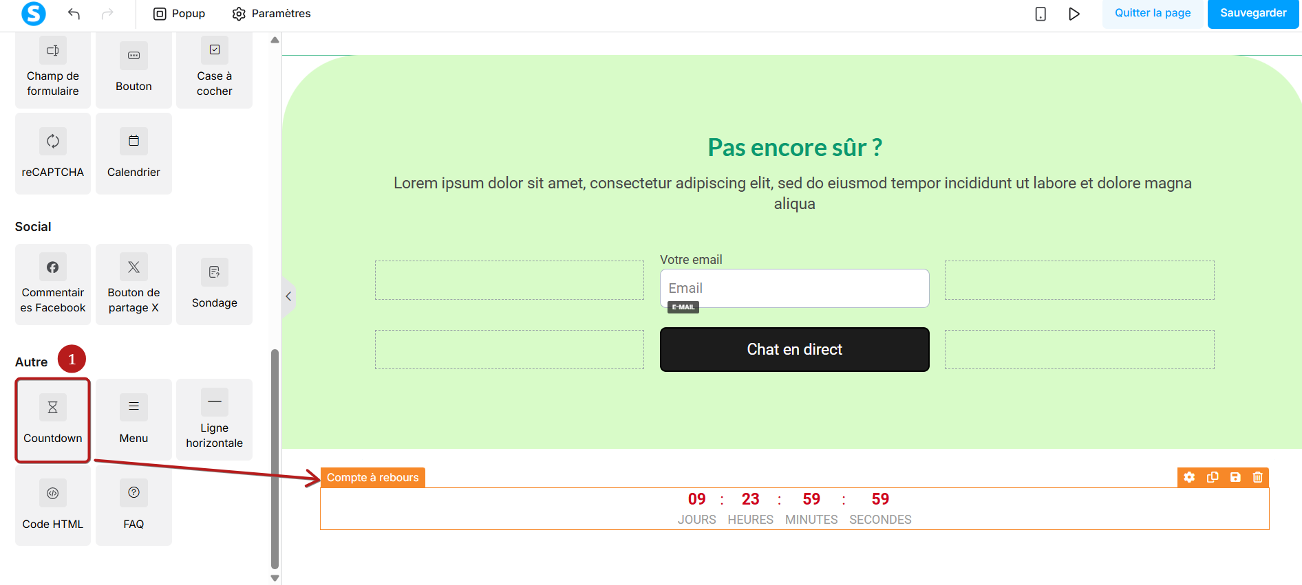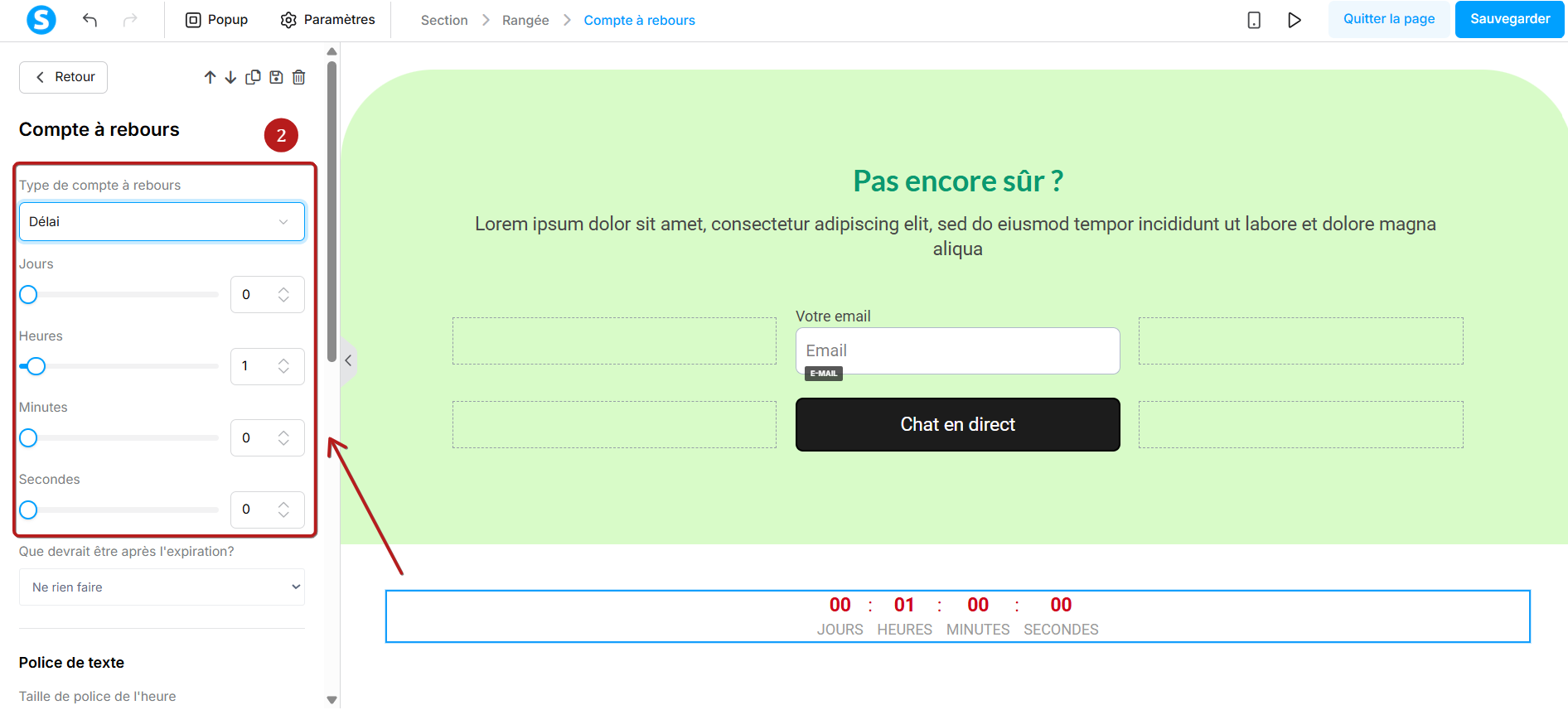 Placez votre curseur sur le compte à rebours, cliquez dessus et choisissez l'option "Délai" (2).